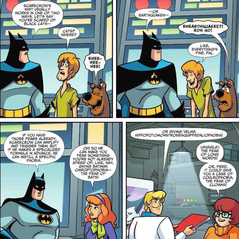 Mientras arrestan a Scarecrow y lo envían lejos (para su desconcierto, como un hombre con dos títulos en campos completamente diferentes), Batman y la pandilla de Scooby teorizan sobre cómo Shaggy y Scoob podrían haber sido inmunes. Batman señala que Velma y Daphne tienen su propia teoría al respecto. Proceden a explicar que Shaggy y Scooby-Doo no eran tan inmunes al gas del miedo de Scarecrow como Están acostumbrados a vivir con esos miedos todos los días, Ya tienen miedo de todo. Como resultado, la toxina del Espantapájaros tiene poco o ningún efecto sobre ellos.
