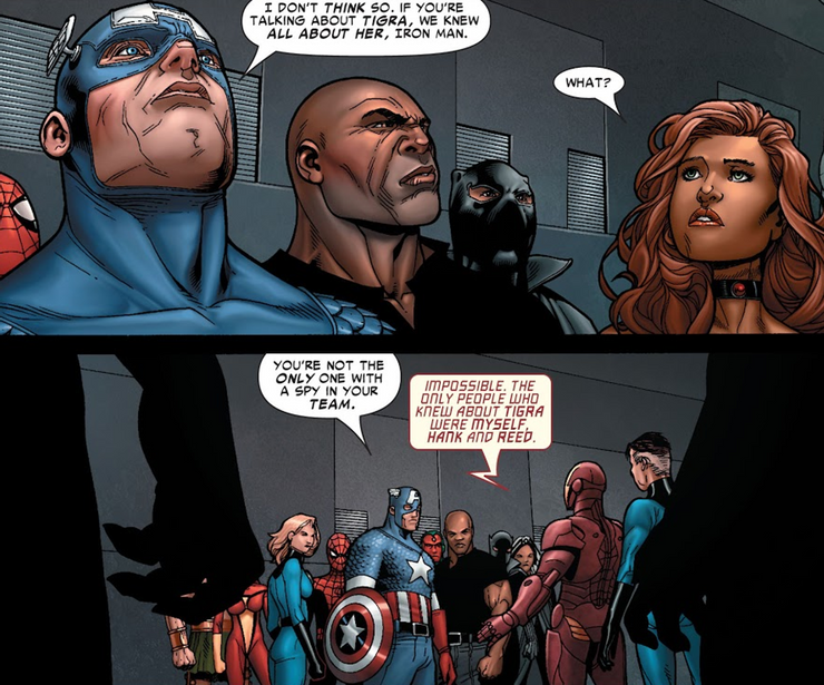 Iron Man sabía que el equipo del Capitán América vendría a la prisión porque tenía un topo del lado de Cap que le estaba dando información a Iron Man. La traidora de los Vengadores era la ex compañera de equipo de los Vengadores de la costa oeste de Tony, Tigra, y aunque ella era responsable de que Iron Man interceptara al ejército del Capitán América en la prisión, todo era parte del plan más grande de Cap. El Capitán América revela en este número que sabía que Tigra era una espía todo el tiempo, y quería que ella le contara a Iron Man sobre este plan para poder manipular su enfrentamiento final a su favor. Después de que se hace esta revelación, Tigra no responde por su traición a medida que la historia avanza hacia la pelea final y luego termina con la rendición del Capitán América. Sin embargo, lo que el libro aborda es la mayor complejidad de usar espías durante la guerra, ya que el Capitán América también revela que también tenía un informante en el equipo de Iron Man, uno que Stark desconocía por completo hasta la gran revelación.