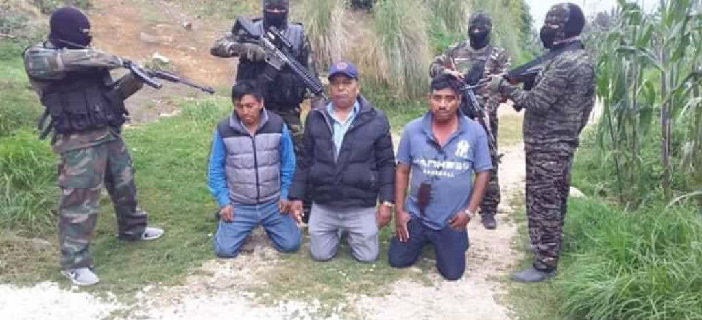 En la fotografía, los hombres apuntan con armas conocidas como cuernos de chivo, al Regidor y los dos “mayoles”, quienes se encuentran hincados en un camino de terracería. A su alrededor hay sembradíos de maíz.