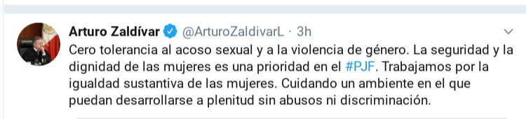 “Cero tolerancia al acoso sexual y a la violencia de género. La seguridad y la dignidad de las mujeres es una prioridad en el Poder Judicial de la Federación”, expuso Zaldívar en su cuenta de Twitter.