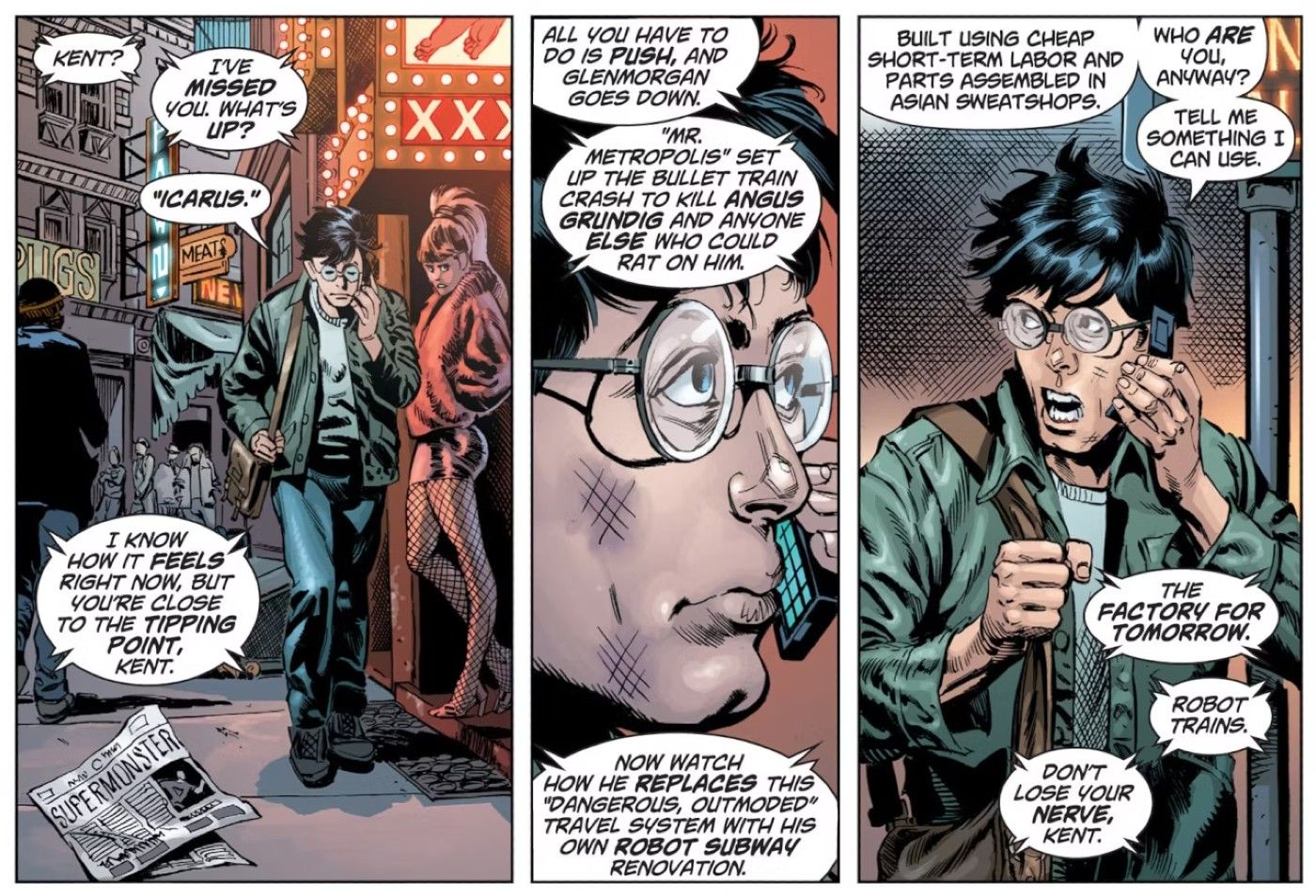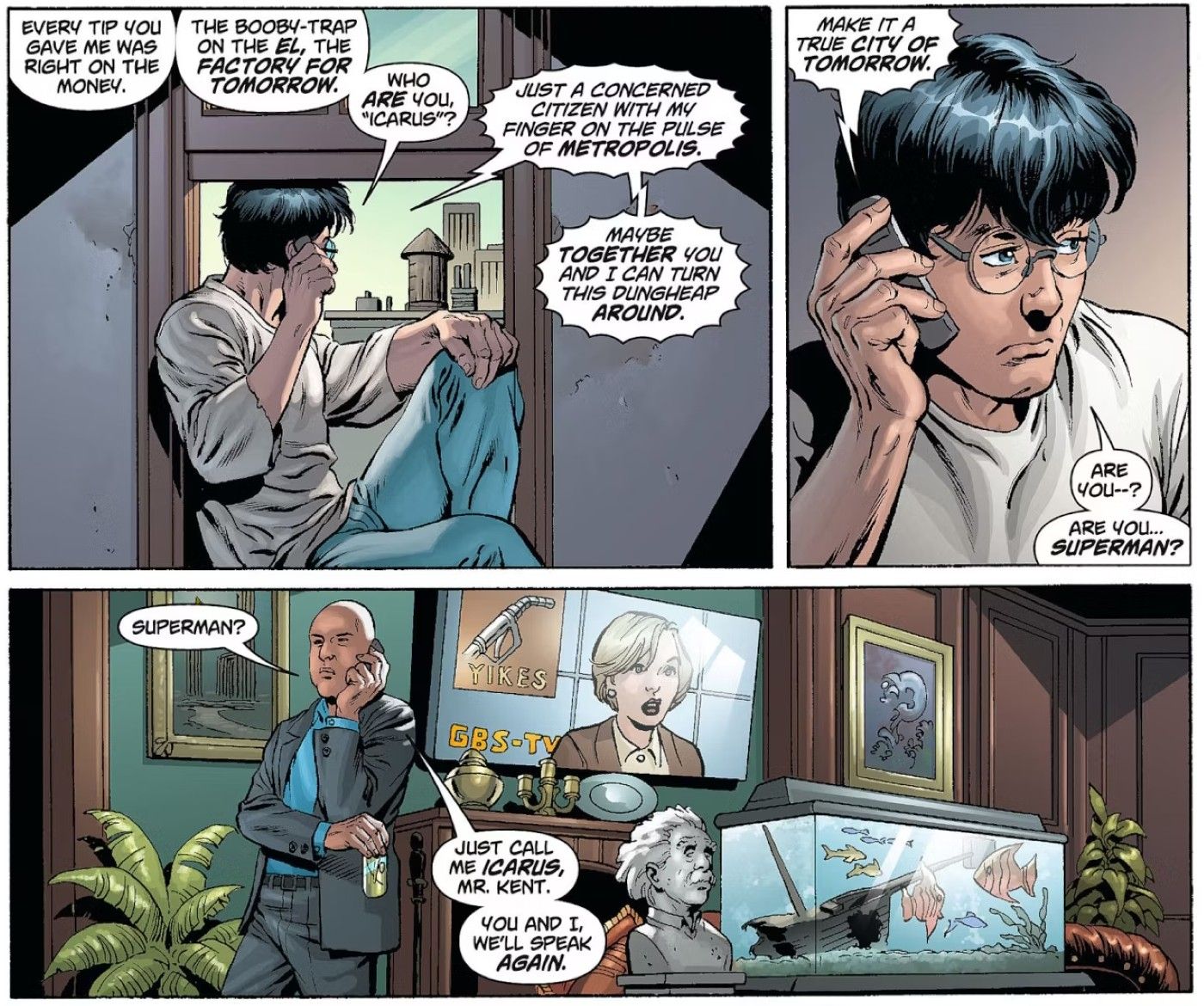 Lex Luthor es en parte responsable de la carrera de Clark Kent se revela en Cómics de acción #8 de Grant Morrison, Rags Morales, Brad Walker, Rick Bryant, Bob McLeod, Brad Anderson, David Curiel y Patrick Brosseau. A lo largo de los primeros números de esta edición Cómics de acciónClark es contactado ocasionalmente por una persona misteriosa conocida como Ícaro, que luego se revela como Lex.