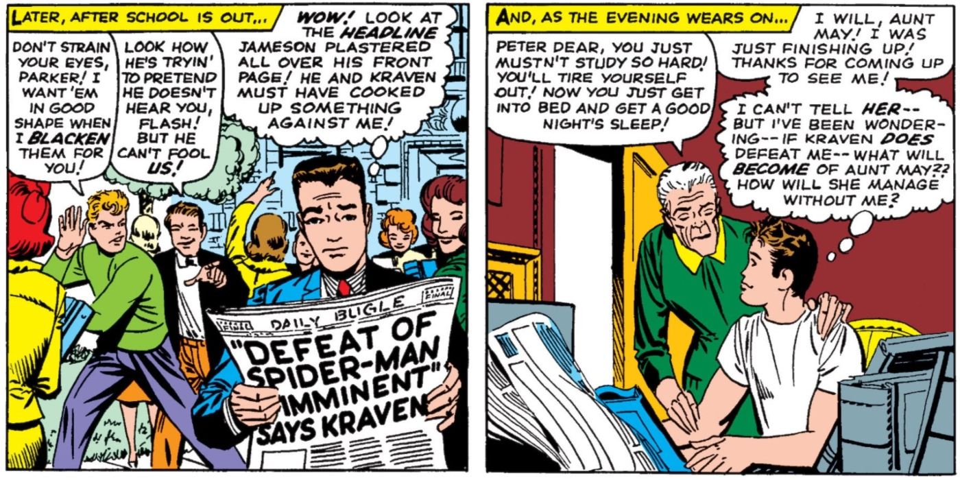 - El periódico publicó una cita de un villano, Kraven el Cazador, afirmando que la derrota de Spider-Man era inminente, mostrando el prejuicio injusto del Bugle contra el superhéroe.