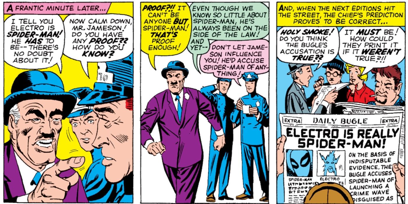 Esto es un ejemplo de Informes irresponsables del Daily Bugleya que se centró en un ángulo que se adaptaba al prejuicio actual del periódico contra Spider-Man en lugar de informar la verdad.