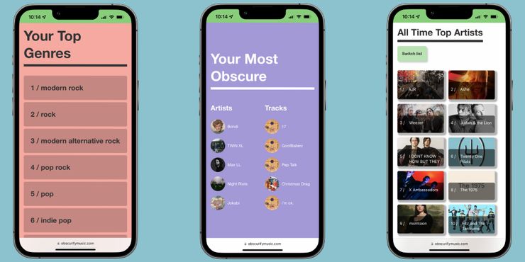 Obscurify primero muestra a los usuarios sus 10 géneros principales. Tocar/hacer clic en un género muestra a los tres artistas más responsables de él. Por ejemplo, el pop figura como mi género número cinco, gracias a la frecuencia con la que escucho Ashe, X Ambassadors y The 1975. A medida que avanzas en la página, Obscurify muestra a los usuarios sus artistas y pistas más oscuros. Si escuchas un artista o una canción que no es convencional o demasiado popular, aquí es donde los verás.