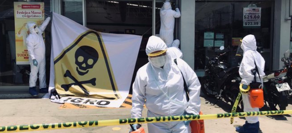Los activistas aparecen portando trajes y botas protectoras, guantes y cubrebocas, mientras uno de ellos dispersa un líquido en el suelo de la entrada de la sucursal.