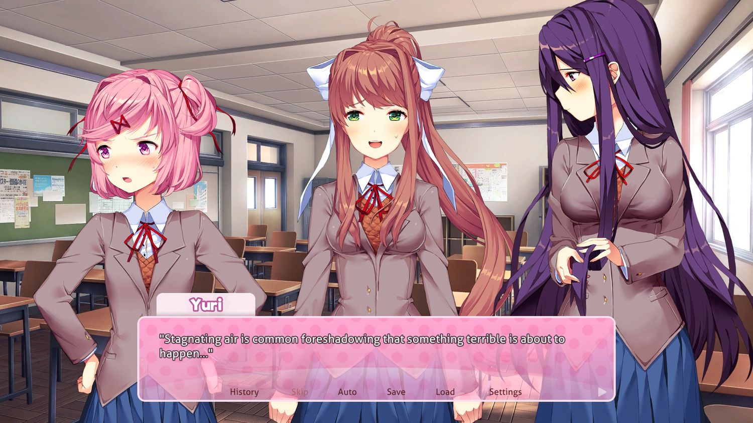 ¡Club de Literatura Doki Doki! es deliberadamente básico desde una perspectiva de juego, y el jugador solo puede hacer clic en el diálogo, tomar alguna decisión aquí y allá y participar en pequeños minijuegos para escribir poemas. Esto funciona bien tanto dentro de su estructura de novela visual como en sus elementos más de terror, ya que el juego es capaz de pasar de una simplicidad acogedora a la sensación de estar atrapado sin agencia extremadamente rápidamente. Mientras tanto, ¡Club de Literatura Doki Doki! Utiliza cuidadosamente la repetición del juego para generar miedo, particularmente con fallas visuales y de audio, y la manipulación de la banda sonora del juego.