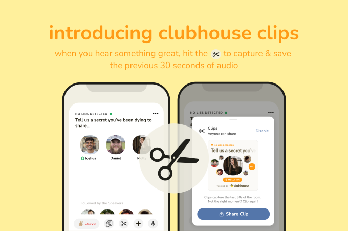 Los clips permitirán a los oyentes en vivo en salas públicas recortar los 30 segundos más recientes de audio y compartirlos en cualquier lugar; por lo tanto, si está escuchando a un orador que dice algo particularmente sabio (o no), puede crear un clip, que genera un momento para compartir con un enlace para unirse a la sala. Estos se pueden compartir en otras plataformas de redes sociales. Los anfitriones pueden decidir si quieren o no que los oyentes puedan hacer clips en su habitación; si los clips están activados, los usuarios podrán tocar un icono de tijera para hacer uno.