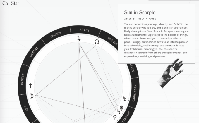 Si no has oído hablar de Co-Star, puedes estar en los círculos equivocados. En algunas escenas sociales es bastante ubicuo. Siempre que las conversaciones se inician comparando tablas astrológicas, es útil tener esa información a la mano. La tendencia es tan notable que la aplicación incluso recibió un grito en un artículo del New York Times sobre VCs que acuden en masa a las nuevas empresas de astrología.