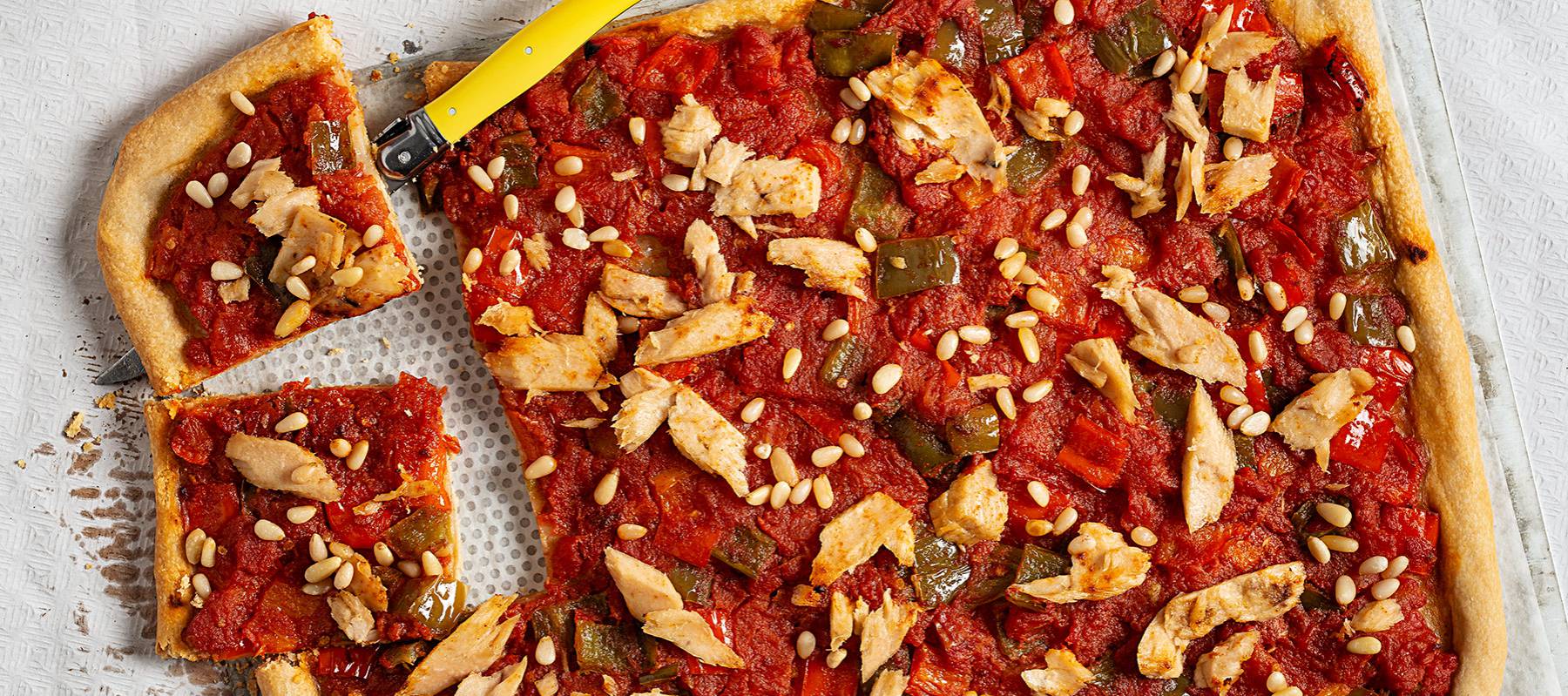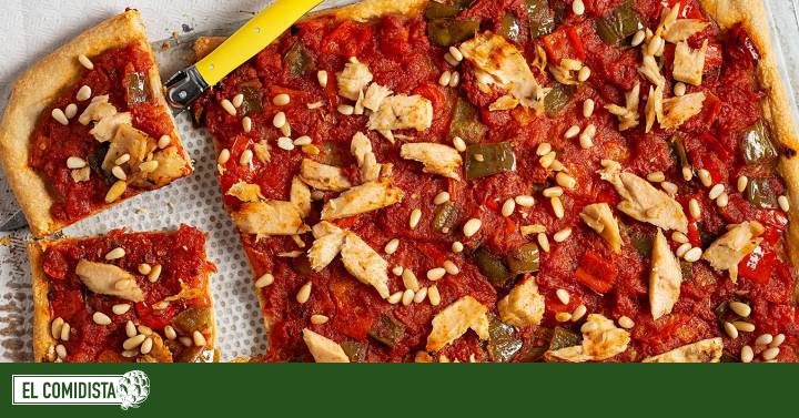 Entre la maravillosa variedad de cocas del Levante está esta coca de tomate destapada; así se denomina a un sencillo pastel salado sin tapa, compuesto nada más que por una base de masa de harina, aceite y algún líquido, cubierta por un relleno de verduras, pescados o carnes, en contraposición a una coca tapada, que se asemeja sospechosamente una empanada. Aunque esta coca se llame con frecuencia de tomate a secas, este suele ir acompañado de pimiento verde y rojo, atún, que para ser fieles al original debería ser ijada (ventresca) de atún salada –tonyina de sorra seca en salazón-, y piñones. Si no tenemos acceso a este atún en salazón, usaremos atún en conserva de aceite.