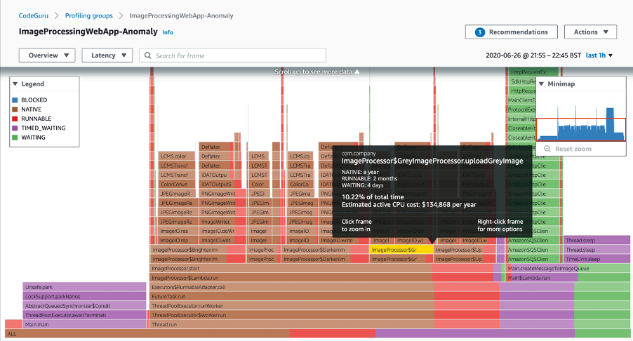 CodeGuru Application Profiler tiene una misión algo diferente. Su objetivo es ayudar a los desarrolladores a descubrir dónde podría haber algunas ineficiencias en su código e identificar las líneas de código más caras. Esto incluye soporte para plataformas sin servidor como AWS Lambda y Fargate.