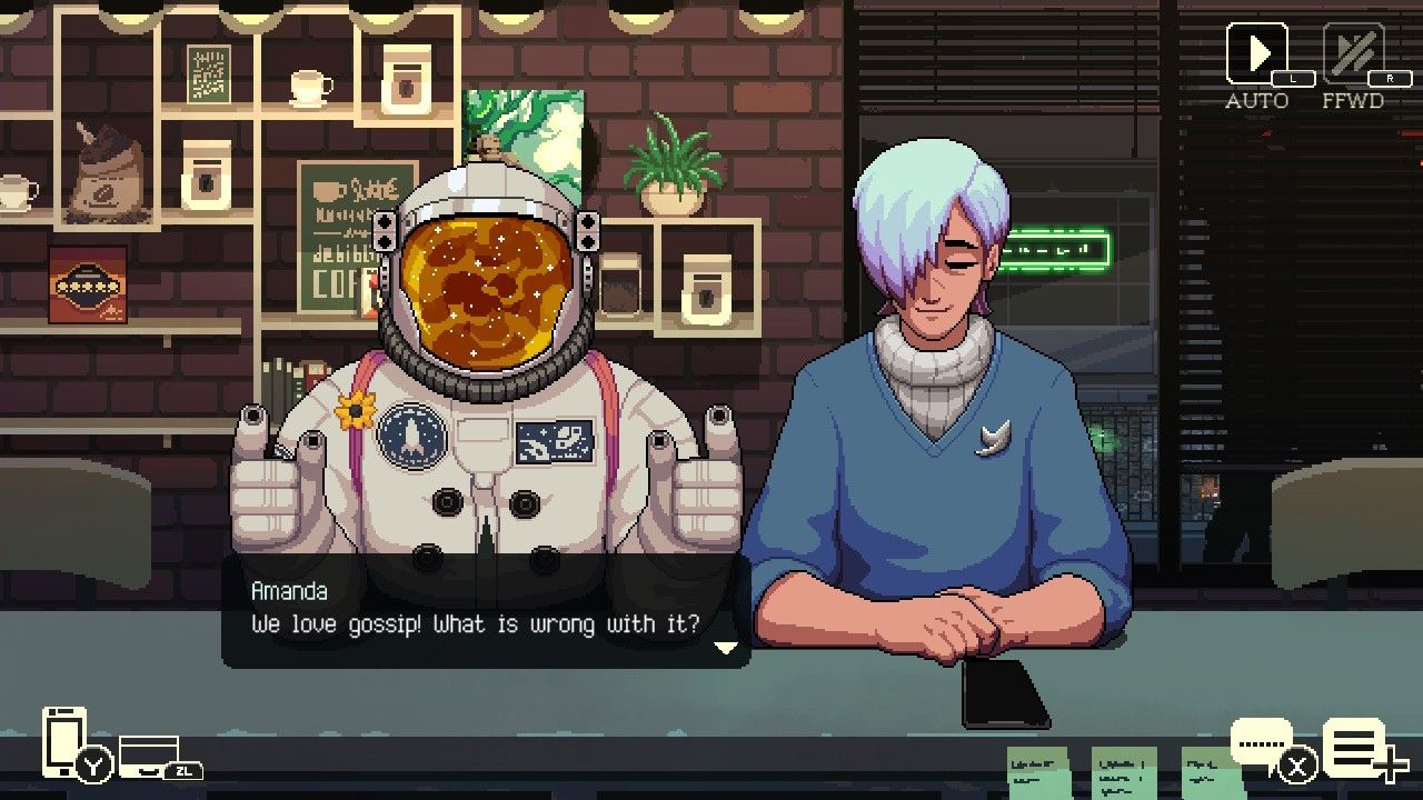 Al final, solo un hilo narrativo decepcionantemente parece que no recibió suficiente atención cuando se trata de su resolución, que no discutiremos debido a posibles spoilers. A pesar de esto, cada historia es lo suficientemente atractiva a su manera, y esto, combinado con gráficos encantadores y una banda sonora de baja fidelidad, lo convierte en un juego bastante relajante. Esto es especialmente cierto con café charla episodio 2La opción de reproducción automática de diálogos, que es quizás la forma ideal de experimentar el título, hace que cada día se sienta más inmersivo.