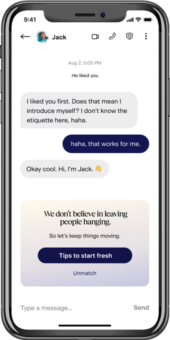 Y si está en la aplicación, puede visitar la conversación para obtener sugerencias de iniciadores de conversación que lo ayudarán a retomar las cosas, o puede tocar un botón para desvincular al otro usuario. Este último enviaría una señal más explícita al destinatario de que hubo una falta de interés, aunque en realidad no enviará una notificación que le diga al usuario que no ha sido igualado. (Eso a veces puede conducir a problemas de seguridad, particularmente para las mujeres que han recibido amenazas de hombres que han rechazado).