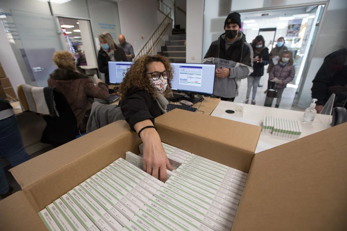 El reparto de test de 125.0000 test de antígenos gratuitos ha comenzado este jueves en seis puntos de Torrejón de Ardoz, de casi 130.000 habitantes. Frente al Consistorio del municipio madrileño, la cola de jóvenes, mayores y niños que acudían a recoger su prueba rodeaba toda la Plaza Mayor del pueblo situado a 30 kilómetros de la capital. Los vecinos se han acercado a los mostradores donde los funcionarios, tras las mamparas de plástico, les proporcionaban los test después de chequear que estuvieran empadronados en Torrejón de Ardoz. El test no es el mismo que proporciona de manera gratuita la Comunidad de Madrid desde el pasado miércoles, aunque solo los más afortunados han conseguido hacerse con uno esta semana, pero “tiene unas características muy parecidas”, según fuentes de su Ayuntamiento. Una situación similar se ha vivido esta mañana en las juntas municipales de distrito de Móstoles (209.000 habitantes), con el reparto de los primeros 100.000 test adquiridos por el Consistorio para los vecinos empadronados en la segunda localidad más poblada de la región. El equipo de gobierno, formado PSOE y Podemos, tiene ya encargada una segunda remesa para los próximos días en caso de que se agote esta primera.