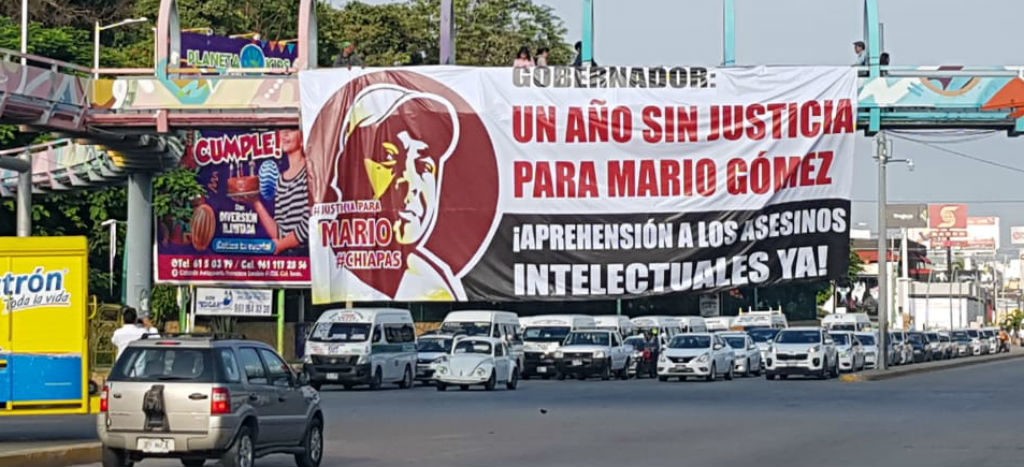 Antes, periodistas de Chiapas colgaron una lona con la imagen de Mario Gómez, en la avenida principal de la ciudad. En la nota se pide la detención de los asesinos intelectuales del homicidio.