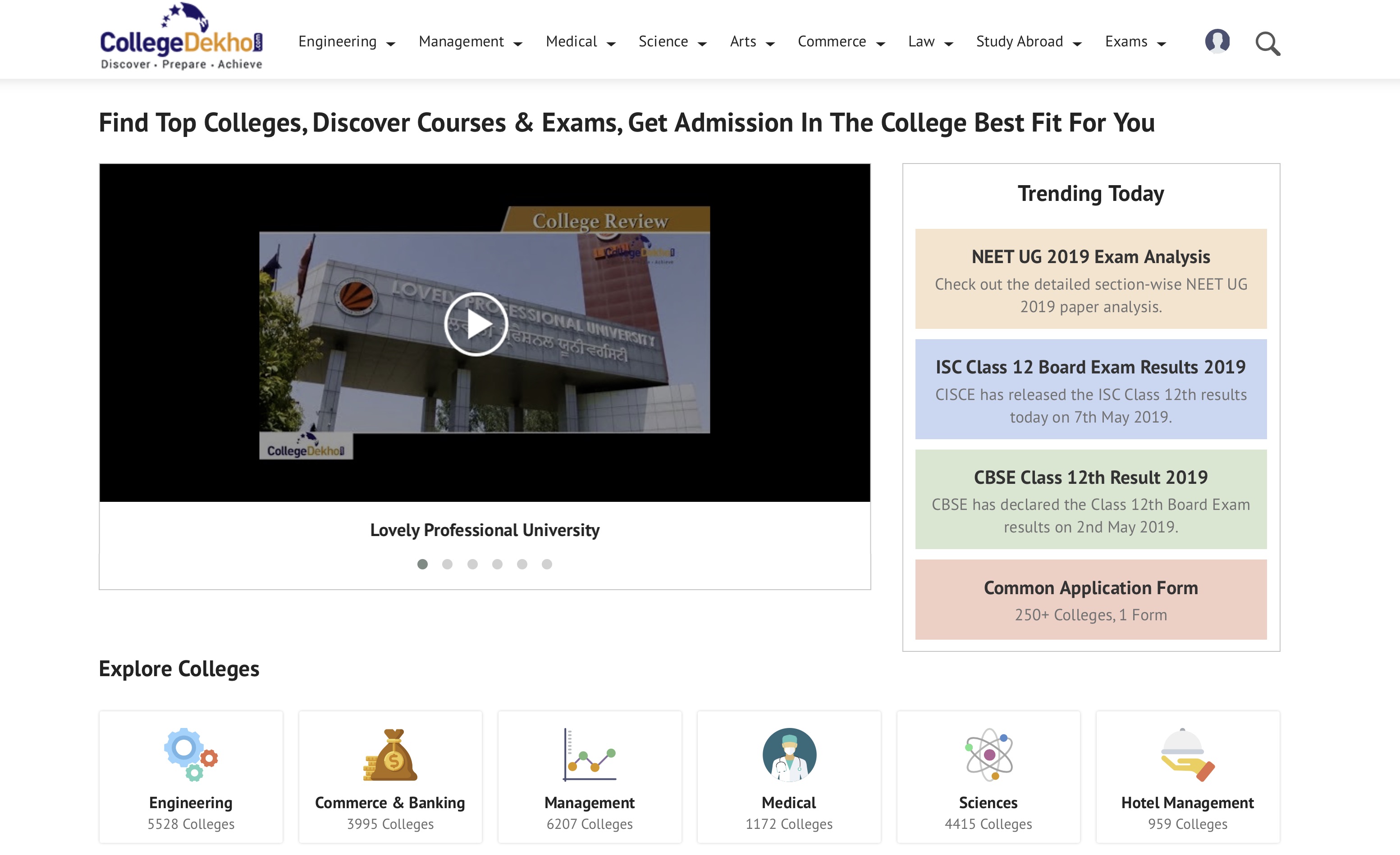 CollegeDekho, hindi para la búsqueda de la universidad, mantiene un sitio web que ayuda a los estudiantes a identificar las opciones de carrera adecuadas para ellos. El sitio web tiene un chatbot que responde algunas de las preguntas que tienen los alumnos al registrar sus respuestas y otras actividades del sitio web como el tipo de universidades que están buscando en la plataforma, su ubicación preferida y su presupuesto.