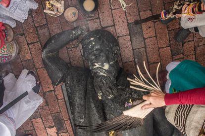 ¿Qué hacer con los monumentos derribados?, ¿dónde ubicarlos?, ¿qué fin darles? No hay todavía una decisión y estas serán las preguntas que tendrá que responder el diálogo abierto con las comunidades. En Bogotá, donde el diálogo avanza, ya se habla de algunas propuestas. Una de ellas es trasladarlos a museos, como lo han hecho otros países que transitan la misma discusión. “Llevarlos a museos como escenarios para debates difíciles de pasados difíciles. Puede ser una opción que, por ejemplo, Gonzalo Jiménez de Quesada termine como un documento en uno de ellos. Ahora, surgen más preguntas, ¿cómo lo presentamos? Lo restauramos por completo o mostramos las marcas de su caída?”, dice Morales. Las otras opciones que contemplan son una cátedra de historia que vaya por las regiones por donde pasó y generar debates; y una alternativa que propusieron las comunidades indígenas de la capital: hacerles rituales mortuorios. Así lo acaban de hacer con el conquistador español. El pasado 20 de junio, en el solsticio de invierno, la comunidad Muisca le hizo una caminata fúnebre a Gonzalo Jiménez de Quesada. Su propuesta, dice Morales, era “dejarlo partir y perdonarlo, para poder seguir y cerrar sus cicatrices”. Ellos lo han explicado así: “Hacer mortuoria es ‘limpiar al muerto’, es decir saldar la deuda material y espiritual que dejó, sanar la historia o memoria de todo y a todos los que afectó. Caminamos para saldar la deuda y asegurar la no repetición de esta historia”.