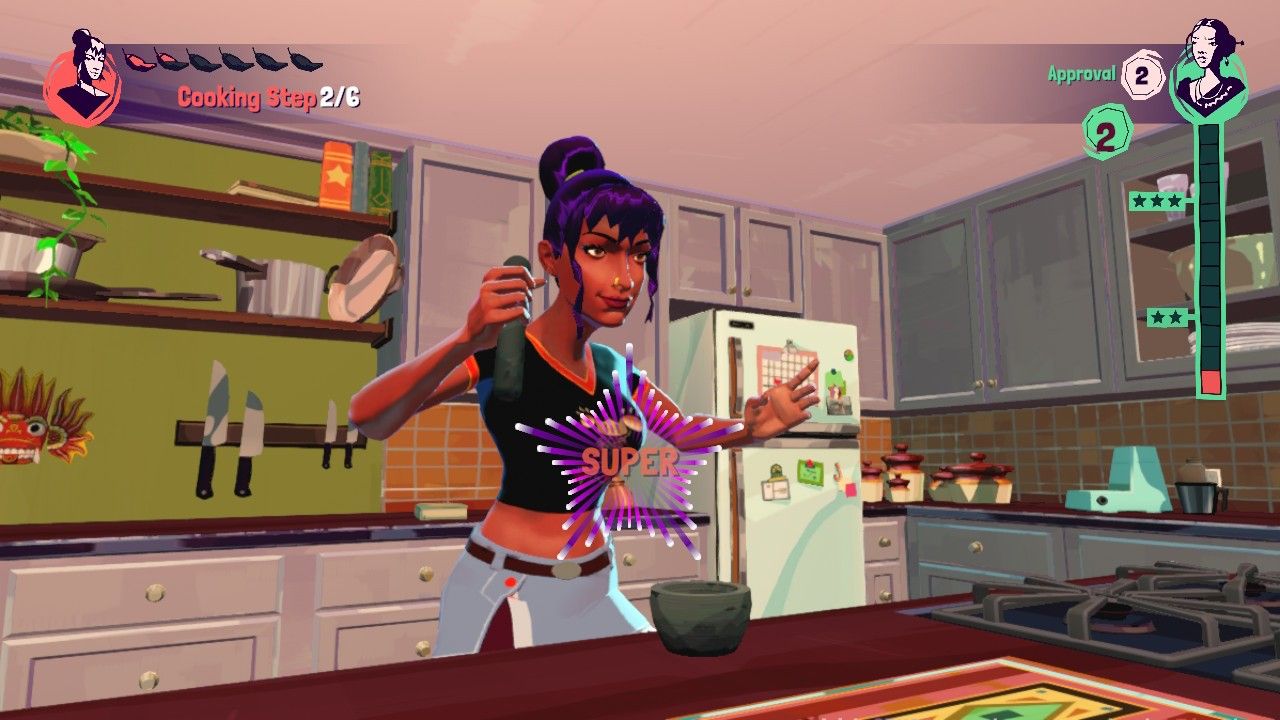 Si bien el combate es la forma en que Jala repara las cosas con sus ex, la cocina es la forma en que intenta recuperar la cercanía con su familia. Cada receta se divide en una cierta cantidad de pasos, cada uno de los cuales tiene el mismo estilo de movimientos cronometrados que el combate, pero para cosas como revolver y freír. Ya sea que una receta se haga con su madre o su padre, Jala busca ganar la mayor aprobación posible a través de movimientos perfectos, y ganará Calor en cada turno, lo que puede usarse para movimientos de cocina más sofisticados, felicitar a sus padres o obtener un multiplicador de puntos. invocando a sus antepasados.