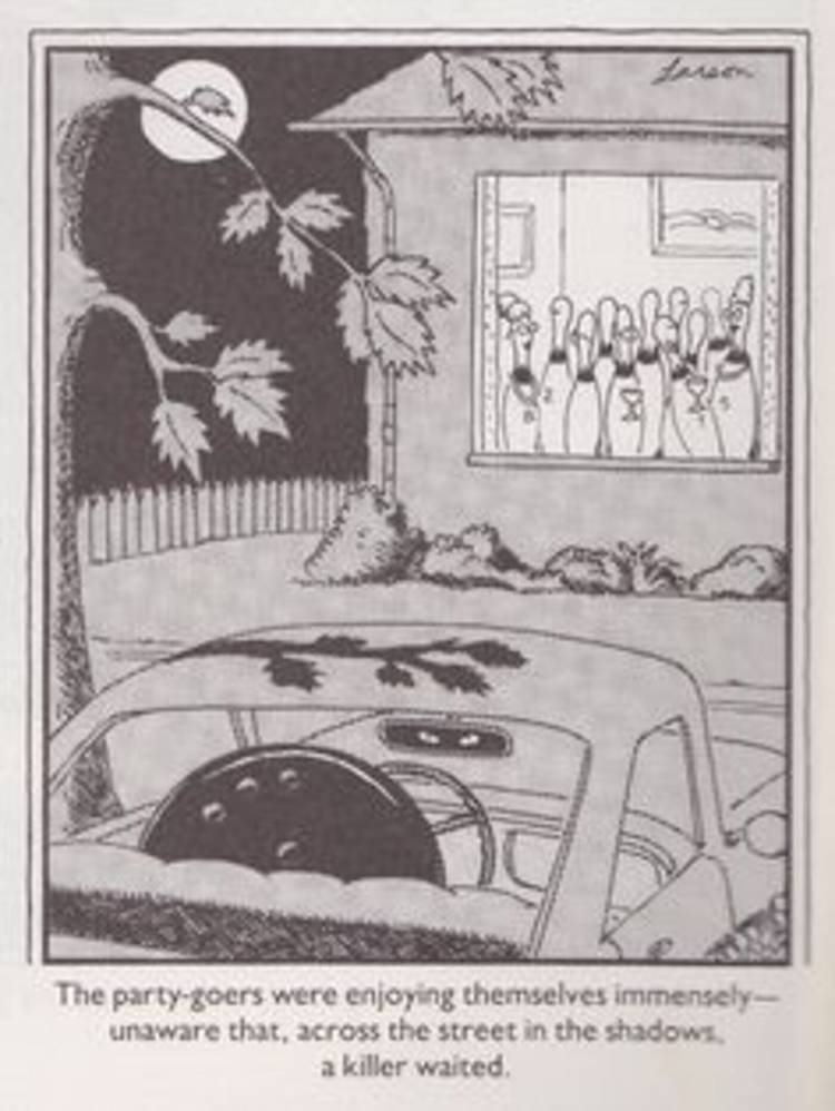 Además, esto Lado lejano Comic Strip también es otro para agregar a la larga lista de tiras cómicas que usan el humor negro de la propiedad; Con el acecho nocturno de bolas de bolos asesinos, lo que se consideraría suspenso y divertido si los personajes fueran humanos, se hará que sea tonto, absurdo y humorístico debido a que transformar los personajes para ser herramientas de bolos.