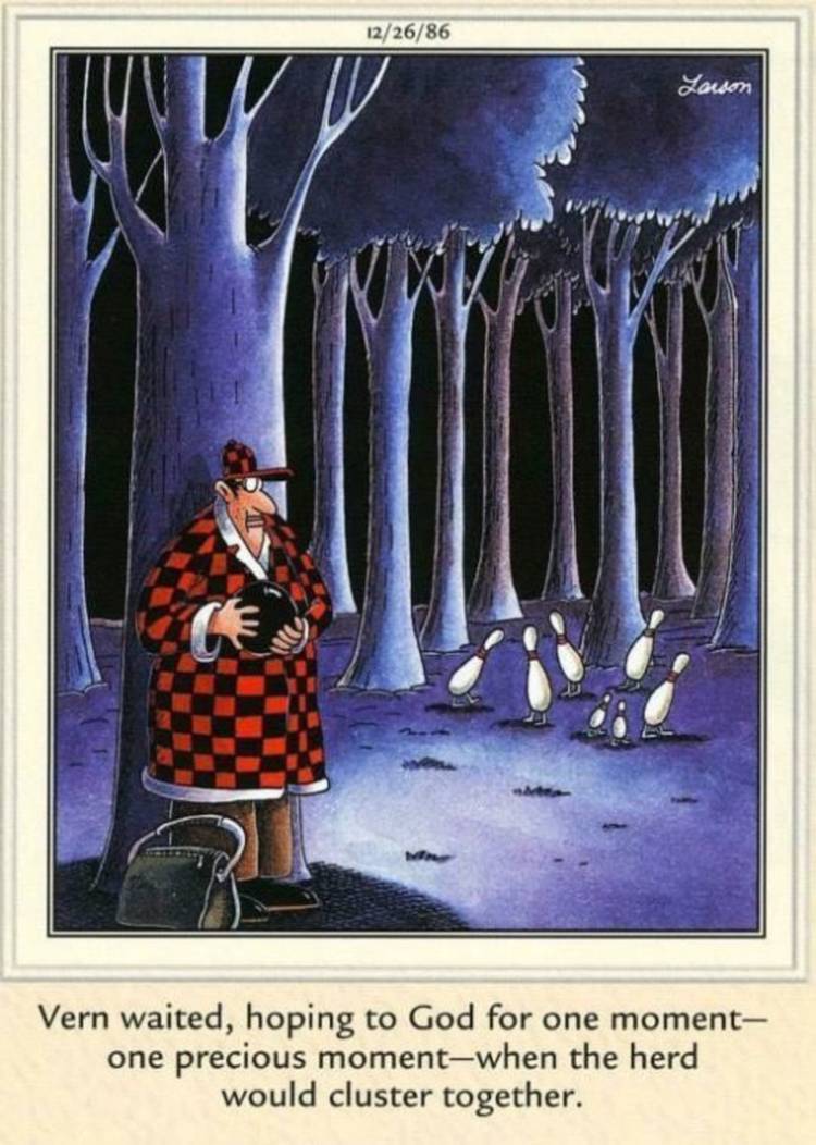 ¿Está cazando los alfileres de bolos para comerlos, o usarlos como una decoración de la casa como un cazador en el mundo real lo haría con las astas? La tira cómica nunca se extiende más allá de los eventos del cazador que solo mira a su presa de bolos, por lo que los lectores de esta tira cómica nunca se enteran. Tal vez el Lado lejano ¿Hunter solo quiere una huelga en la naturaleza?