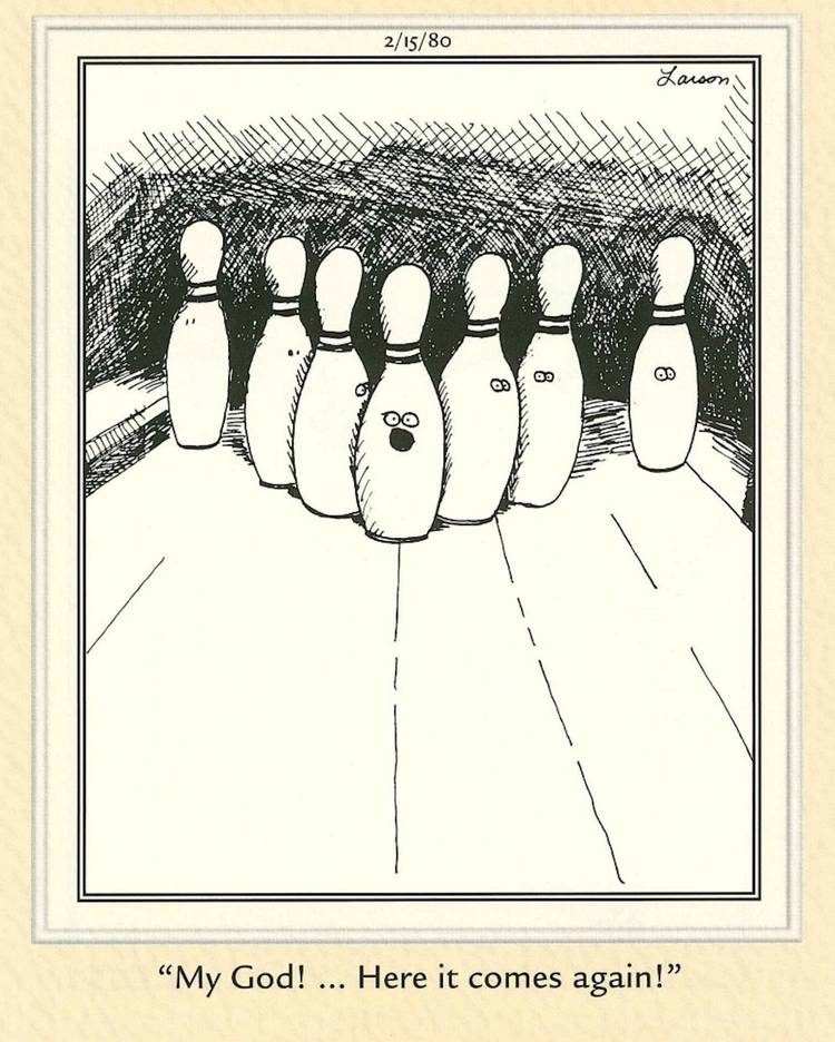 El lado lejano Tenía la costumbre de imaginar diferentes escenarios problemáticos para personajes no convencionales. Perfectamente en línea con ese hábito está esta tira cómica, que representa una realidad horrible … de la que los lectores aún pueden reír. Un alfiler de bolos se encuentra con sus compañeros con una mirada horrorizada en su cara, aterrorizado por el objeto misterioso entrante que viene en su camino … nuevamente.