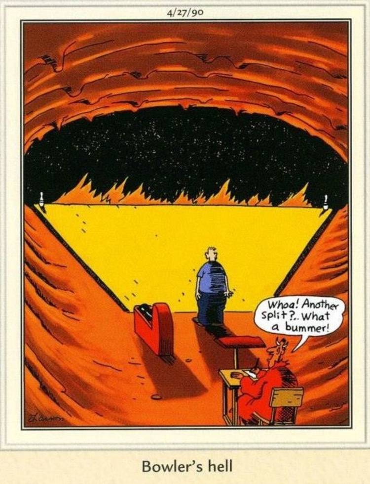 En el infierno de Bowler, todos se dividen. Pero no solo una división normal de la fábrica. En cambio, los dos alfileres se dividen a una milla de distancia, con fuego llenando los huecos entre los dos alfileres. Sin absolutamente ninguna posibilidad de obtener ambos alfileres derribados de un solo disparo, un jugador de bolos está atormentado.