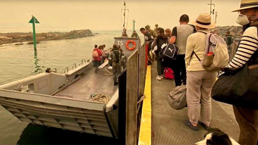 “El operativo de evacuación en Mallacoota ha comenzado con la transferencia del primer grupo a (los buques) Choules y Sycamore para trasladarlos al puerto de Western, en Victoria”, indicó la Marina en un mensaje en Twitter acompañado de imágenes de uno de los barcos rodeado de humo con el cielo rojo al fondo.
