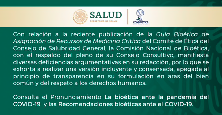 Aunque la postura de la Comisión Nacional de Bioética es escueta, coincide con el deslinde que hizo por su parte la UNAM -cuyo rector es integrante de dicho consejo- que a su vez señaló en un comunicado: “Este fin de semana, el Consejo de Salubridad General hizo público un documento titulado Guía Bioética de Asignación de Recursos de Medicina Crítica, mediante la cual se establecen las disposiciones que orientarán las decisiones del personal médico en caso de que el sistema de salud se vea sobrepasado por la pandemia de la Covid-19. Al respecto, la Universidad Nacional Autónoma de México (UNAM) considera importante hacer la siguiente precisión: 1.- De acuerdo con lo dispuesto por los artículos 15 de la Ley General de Salud y tercero del Reglamento Interior del propio Consejo, corresponde a la Universidad Nacional, específicamente al rector, uno de los asientos destinados a los Vocales Titulares. 2.- Ni la UNAM ni su rector, doctor Enrique Graue Wiechers, han sido convocados a sesión plenaria alguna para el análisis, discusión y eventual aprobación de dicha Guía. Por tanto, la Universidad Nacional se deslinda de los términos y del contenido del referido documento”.