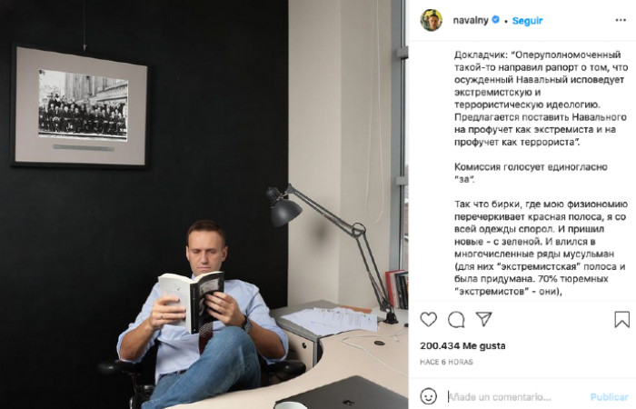 “Es que ahora hay un cartel sobre mi litera que dice que soy un terrorista”, dijo Navalny en el post, que fue publicado con la ayuda de sus abogados.