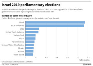Conforme a los cómputos finales, el partido del primer ministro Netanyahu ganó 36 escaños, mientras que el partido Azul y Blanco, de su principal opositor Benny Gantz, obtuvo 35 lugares.