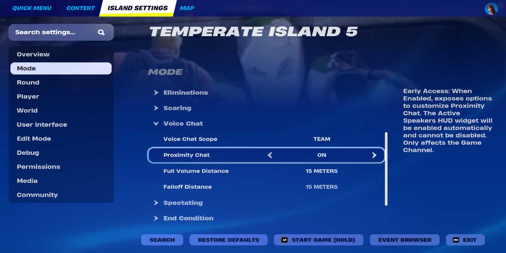 Según información de la Fortnite Portal del creador, Los creadores pueden activar el chat de proximidad yendo a la configuración del chat de voz en el menú de configuración de la isla. Esto habilitará la función para todos los jugadores en ese modo de juego. Los creadores también pueden ajustar el volumen del chat de proximidad y la distancia de caída del sonido.