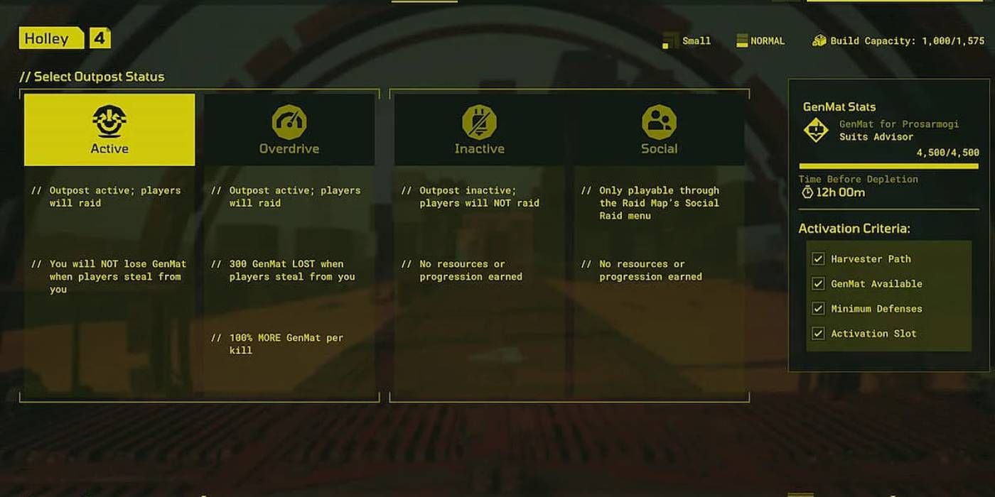 Otras tres opciones además de “activa” permiten a los jugadores configurar su puesto de avanzada de diferentes maneras. Prensado “Sobremarcha” hace lo mismo que “activo”, pero crea mayores recompensas o pérdidas para los jugadores que intentan abordar el puesto avanzado, por lo que los jugadores deben tener confianza en su base antes de elegir esto. Descubrir cómo activar un Outpost también permite a los jugadores configurar la estructura para “Inactivo” para evitar allanamientos o “Social” para limitar las interacciones a amigos solo en Conocer a tu creadormultijugador de .