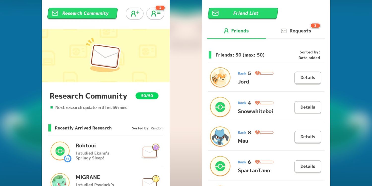 los amigos en Pokémon Dormir se puede acumular en el Comunidad de investigación. Aquí, amigos de todo el mundo, cada 4 horas, recopilará investigaciones y otorgará recompensas al jugador. Una instantánea que un amigo recopile de Sleep Research se parecerá mucho a las Postales de Amigos de Pokémon GO y, dependiendo del nivel de su amistad, el jugador recibirá más recompensas. Una tabla en el sitio web Pokémon Sleep de Serebii.net explica el nivel equivalente de recompensa.