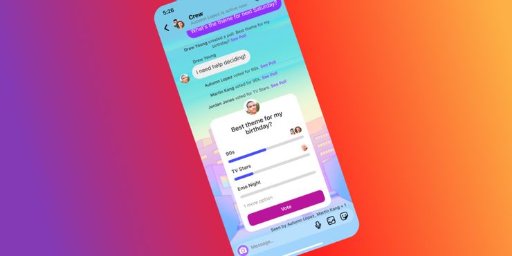 Instagram ha permitido encuestas en Stories desde hace algún tiempo, pero más recientemente trajo la función a chats grupales en DM. La actualización, que se lanzó en marzo de 2022, también trajo muchas otras funciones a los mensajes directos de Instagram. Estos incluyen la capacidad de compartir vistas previas de canciones de 30 segundos de Apple Music y Spotify, la opción de enviar mensajes “en silencio” a amigos sin enviar notificaciones y ver qué amigos están en línea en la parte superior de la bandeja de entrada.