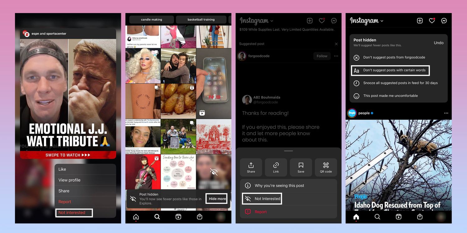 “/> Cuando un usuario de Instagram silencia publicaciones específicas descubiertas a través de la pestaña Explorar tocando ‘No interesado,’ la plataforma garantiza que la acción afectará a futuras recomendaciones. También dejará de sugerir contenido relacionado que aparece en otras partes de la aplicación, como Reels o Search. Además de poder filtrar comentarios y mensajes directos que contienen ciertas palabras, las personas ahora también pueden ocultar publicaciones recomendadas que aparecen en el feed principal de Instagram con las mismas palabras clave marcadas.