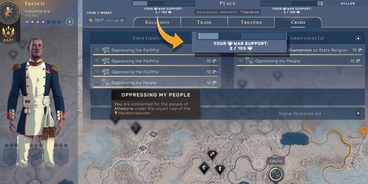 Saber conducir estratégicamente la diplomacia y aumentar la influencia cultural en Humanidad también son excelentes formas de aumentar el apoyo de guerra a un ritmo constante. Influir en una ciudad enemiga o convertirla a la religión de la cultura del jugador dará lugar a frecuentes quejas, que son una excelente fuente de apoyo de guerra. Con respecto a la diplomacia, los jugadores deben decidir qué demandas del enemigo vale la pena aceptar por una pequeña ganancia en apoyo. Los jugadores deben tener en cuenta que el imperio contrario puede emplear esta táctica contra ellos para aumentar también su propio apoyo de guerra. Sin embargo, esta ocurrencia dependerá del estado actual y el poder del imperio del jugador. Los jugadores deberán comprender lo que está en juego en declarar la guerra a un enemigo y elegir entre comenzar un conflicto militar o retirarse en consecuencia.