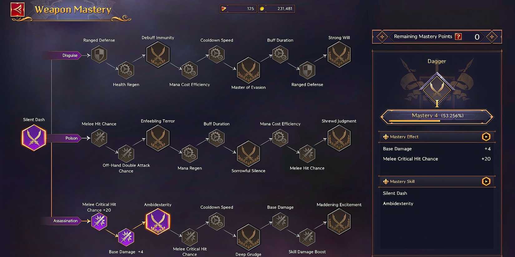 Weapon Mastery es un sistema de nivelación que está vinculado a cada tipo de arma en el juego: daga, arco largo, ballesta, bastón, varita y tomo, espada y escudo, y gran espada. Cuando ganes suficiente EXP de dominio de armas, subirás de nivel y ganarás un punto de dominio de armas. Estos puntos luego se pueden invertir para desbloquear habilidades pasivas en el árbol de habilidades de dominio de armas. El árbol de habilidades de cada arma tiene tres ramas diferentes, cada una con nueve habilidades pasivas para desbloquear.