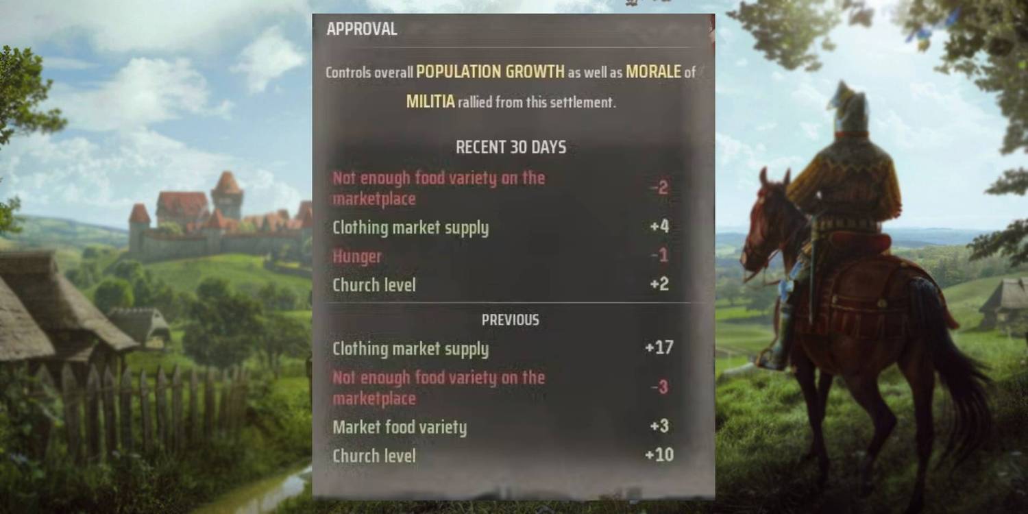 Otros factores, como el hambre, el nivel de la iglesia, la oferta del mercado de ropa y la variedad de alimentos del mercado, también afectan la aprobación total. Si su aprobación cae por debajo del 25 %, las familias comenzarán a mudarse fuera de su comunidad de forma permanente. Este realismo medieval del juego clásico de estrategia en tiempo real refleja cómo una aldea puede volverse desconfiada de su liderazgo y reducir rápidamente la mano de obra que puede necesitar para operar lugares importantes de su ciudad.