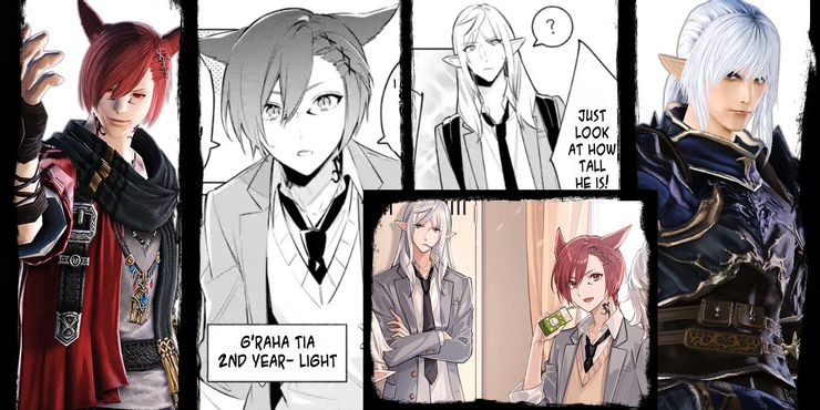 En FFXIV: caminante, G’raha conoce a Estinien y tiene un momento en el que está descaradamente emocionado de conocer a un héroe y al Dragón Azure anterior. En el manga, una escena como esta fue recreada fielmente, mientras su yo de la escuela secundaria se entusiasma con lo genial que es el popular estudiante Estinien. Sin embargo, Estinien permanece distante y ajeno como de costumbre.