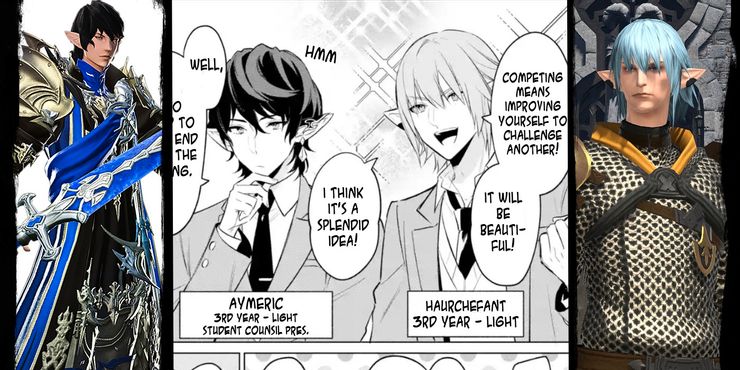 El último FFX IV Los personajes introducidos en el primer capítulo del manga son Aymeric y Haurchefant. En el juego, Aymeric tiene 32 años y Haurchefant 28, pero como muchos otros, se han convertido en estudiantes de secundaria. Aymeric es presidente del consejo estudiantil y de tercer año, adecuado para el líder encantador y responsable. Haurchefant también es un estudiante de tercer año e inmediatamente muestra su brillante positividad durante su breve aparición. Los dos ciudadanos de Final Fantasy XIV Ishgard son buenos amigos de la escuela secundaria Estinien, independientemente de su naturaleza antisocial. Esto encaja con la forma en que Estinien en el juego continúa refiriéndose a Aymeric con desdeñoso afecto.