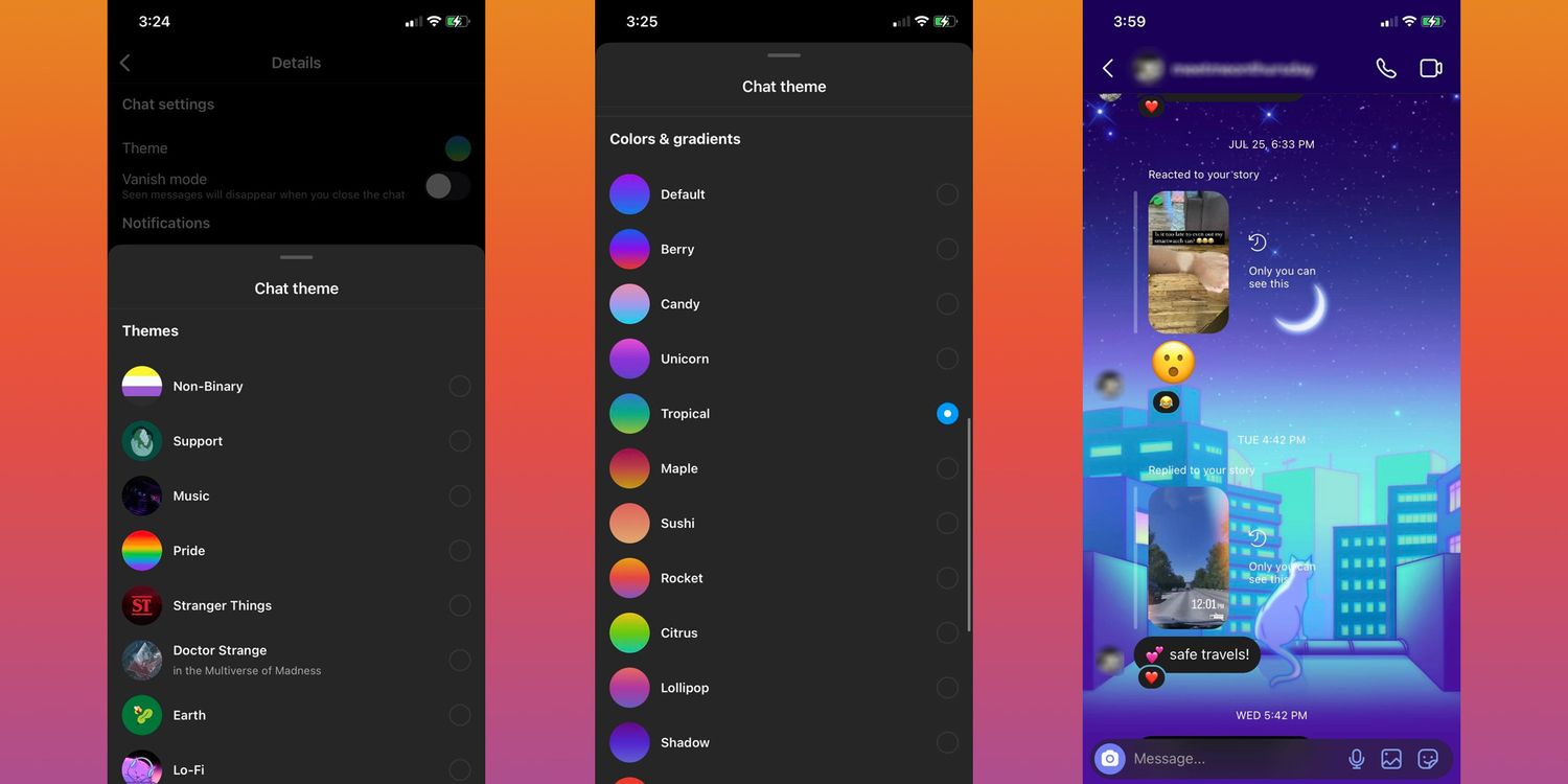 - Los usuarios pueden cambiar el fondo de sus mensajes directos de Instagram seleccionando una conversación, tocando el título y eligiendo un tema u opción de color.