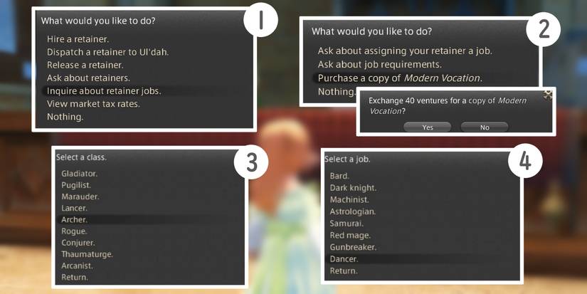 El segundo requisito para cambiar el trabajo de un Retainer en Final Fantasy 14 es el Vocación modernaqué jugadores pueden Comprar Vocación a un sirviente por 40 Ventures. La opción de adquirir una vocación no es evidente desde el principio, ya que el jugador debe seleccionar algunas opciones de diálogo para que aparezca la ventana de compra. Para comprar Vocación moderna: