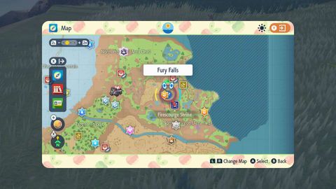 Al este del Gran Cráter de Paldea, Reshiram se encuentra en el borde de un acantilado junto a la cima de una pequeña cascada. al sur de la ciudad de Zapapicopasándolo por alto.