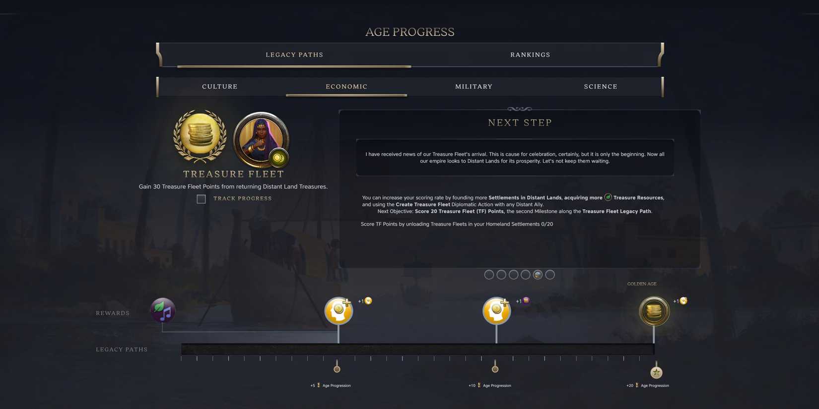 El camino legado económico en la era de la exploración requiere que Viaje a las tierras distantes para establecer flotas de tesoros. Estos se crean estableciendo o conquistando un asentamiento que contiene recursos del tesoro, mejorándolos y construyendo un muelle de pesca para generar flotas de tesoros. Este es un camino legado complicado, y se puede lograr con una variedad de estrategias. Las flotas de tesoros generarán después de un número fijo de turnos, luego deben viajar al continente de la casa para dejar su botín. Las flotas pueden contener múltiples recursos en cada uno, por lo que cuanto más recursos del tesoro en un acuerdo, mejor.
