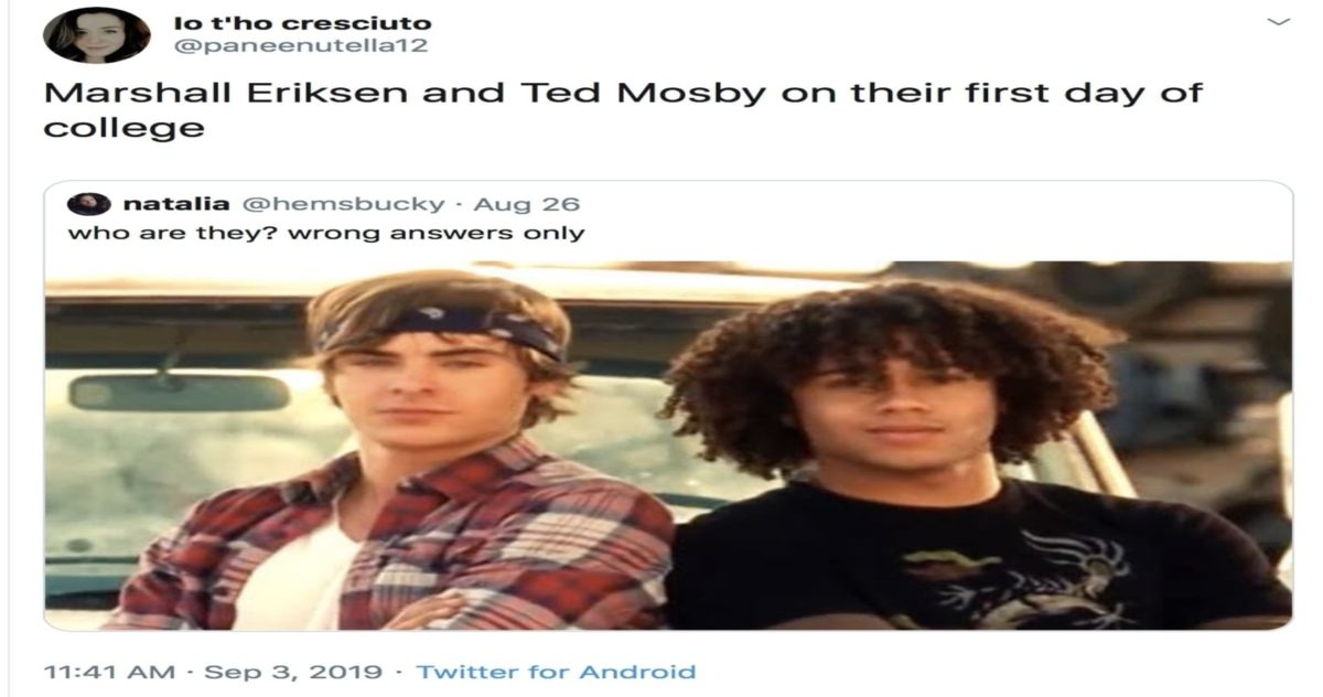 Ted y Marshall lucían looks completamente diferentes mientras estaban en la universidad. Ted se veía especialmente diferente. Tenía una cabeza llena de cabello grande y rizado, muy parecido a Corbin Bleu en la franquicia de High School Musical. College Ted está lleno de historias sobre novias extrañas, Marshall y Lily en tercer lugar, y todos los "sándwiches" consumidos.
