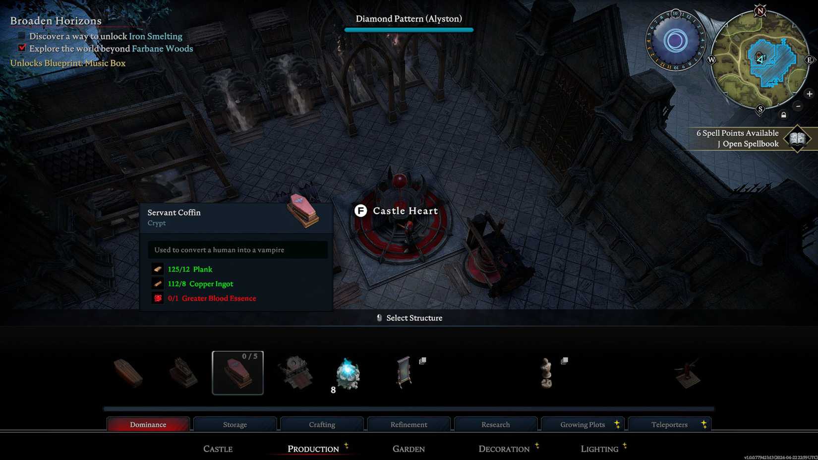 Una vez que el castillo esté en el segundo nivel, Servant Coffins se agregará automáticamente al menú de construcción debajo del Producción pestaña y luego la Dominio filtrar. Cada ataúd utiliza tres componentes, principalmente elaborados en sus estaciones utilizando materias primas.