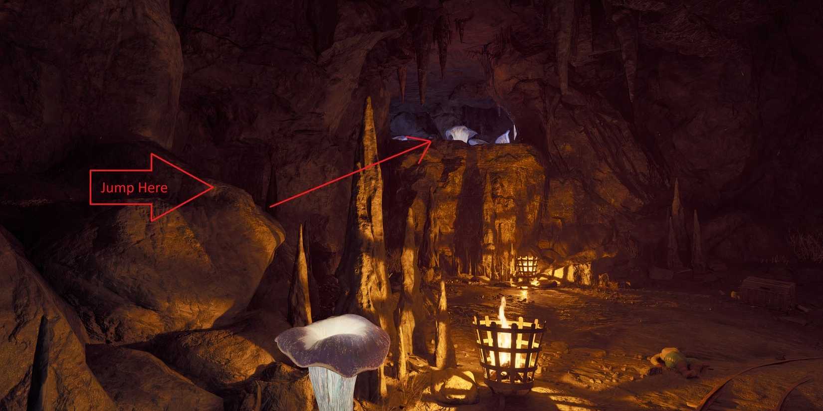 Mientras mira a la repisa, sube las rocas a la izquierda de la antorcha y el hongo en el suelo. Levántate lo más alto que puedas en esa roca, y luego salta hacia adelante. Mientras que en el aire, Use la carga y spam el botón de acción para estacionar la repisa. Una vez que lo subas, estarás libre en casa, y podrás agarrar al amigo de Forge y progresar a través del monte Forja como normal.