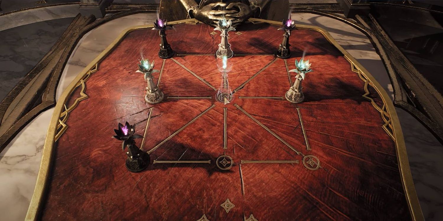 El objetivo aquí es organiza tus piezas blancas en línea recta mientras te aseguras de que tu oponente no forma las piezas negras en una línea. Fallar este rompecabezas inflige a tu personaje la condición Maldita en Resto 2, reduciendo tu salud general en dos bloques por cada acumulación. Esta aflicción se puede curar fácilmente usando el Ungüento purificado objeto, así que asegúrese de tener al menos un par de estos a mano antes de ingresar a la mazmorra.
