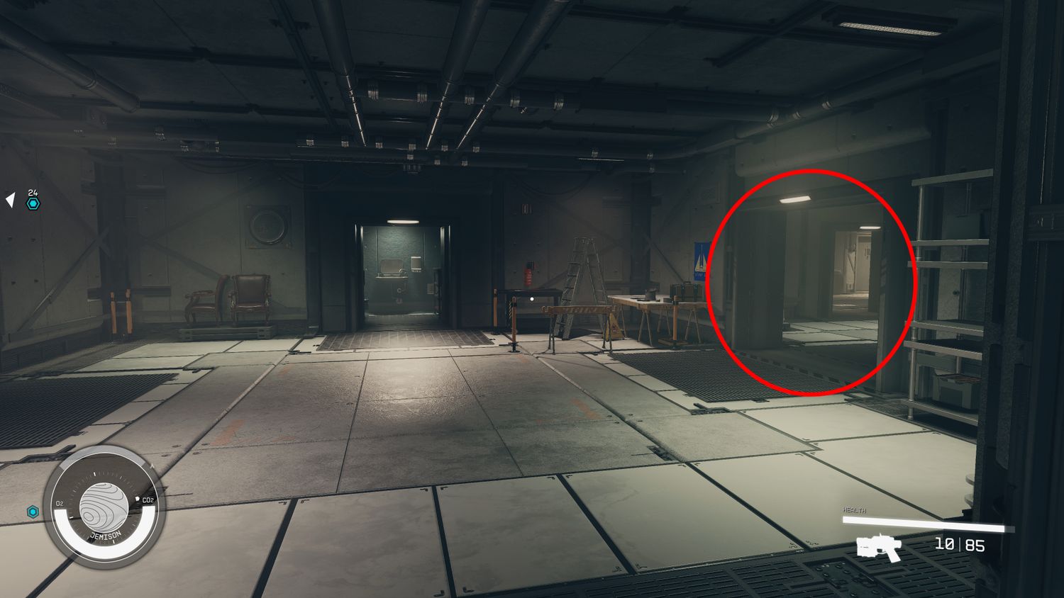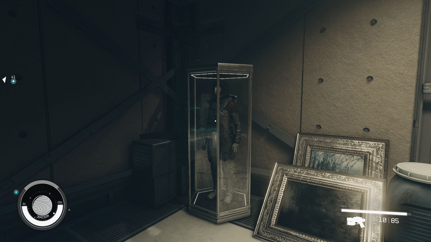 “/> Continúa hasta que termines en un pequeño almacén con algunas cajas y cuadros enmarcados. Ya se puede encontrar el traje espacial Mark I dentro de una vitrina sellada directamente a su izquierda al entrar en la habitación.