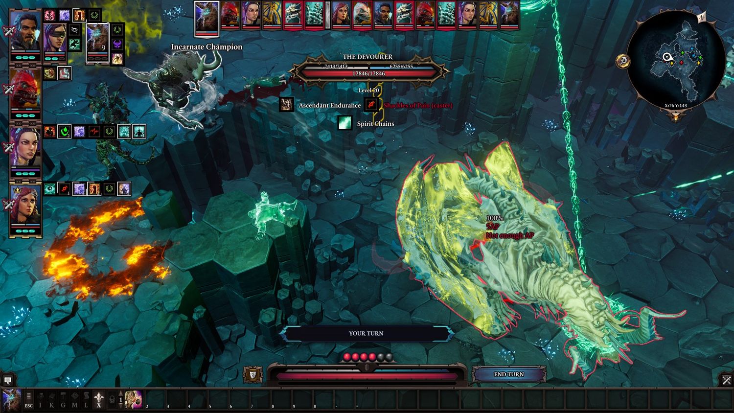 Si eliges ponerte del lado del Soñador en Divinidad Pecado Original 2, encadenarán al Devorador para que el dragón no pueda moverse ni esquivar. Sin embargo, tu personaje principal también sufrirá. Grilletes del dolor durante dos rondas. Habrá múltiples enemigos y aliados alrededor de la habitación. Primero elimina a los minions lo más rápido posible. Después de una o dos rondas, el Soñador quedará noqueado y el Devorador comenzará a atacar. Tiene un alcance enorme y se cura con veneno. Mantén la distancia y usa tantos ataques fuertes y enfocados para eventualmente derribarlo.