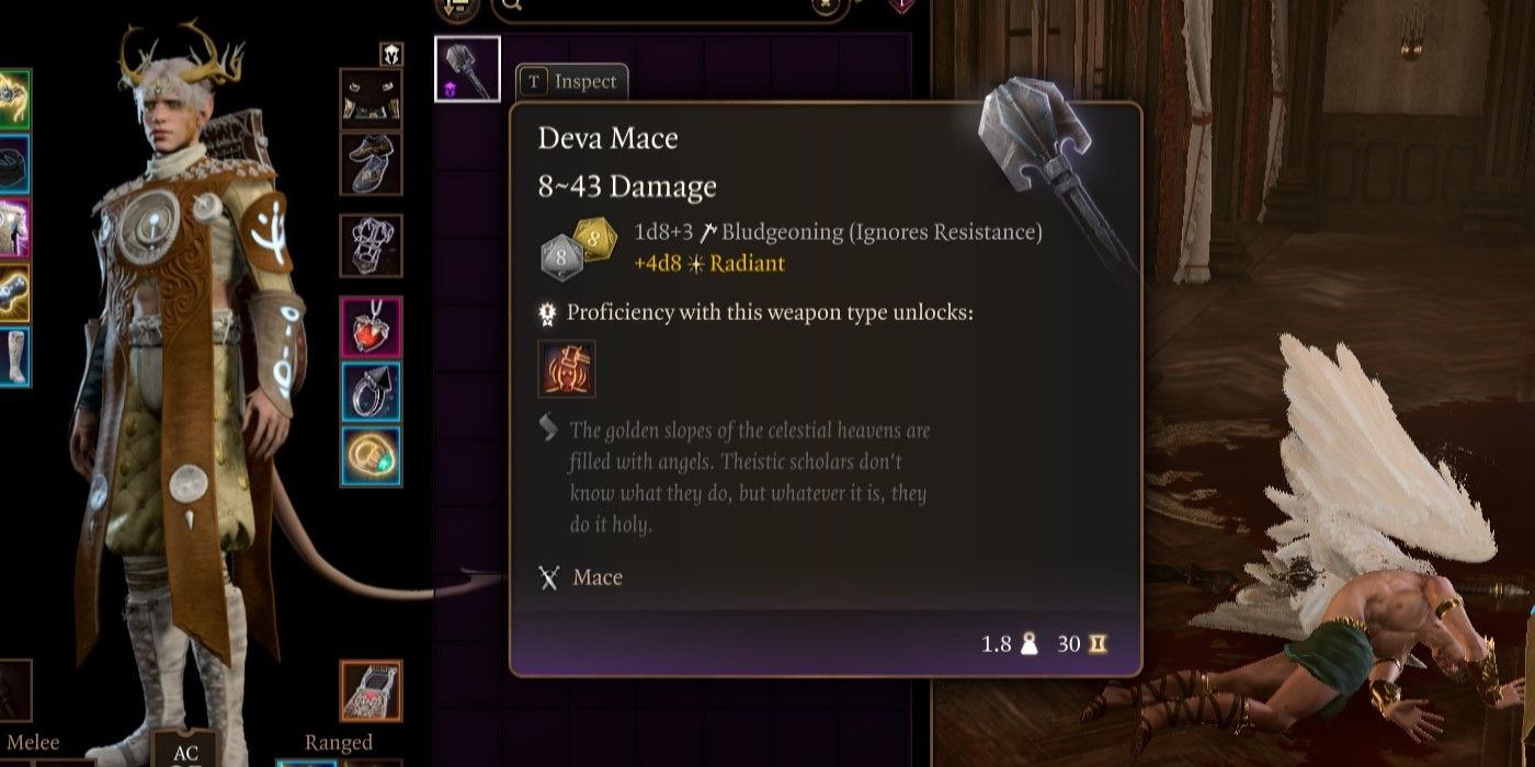 La Deva Mace, que cuenta con una asombrosa 1d6 Contundente + 4d6 Daño radiantesolo se puede encontrar obteniendo la desventaja que se otorga cuando robar del Tabernáculo de Costa Tormenta. La desventaja funciona como una forma de convocar a los Devas, derrotarlos en combate y luego recoger las armas sagradas que dejan atrás. De todas las interacciones y secretos ocultos en BG3, este es uno de los más singulares.